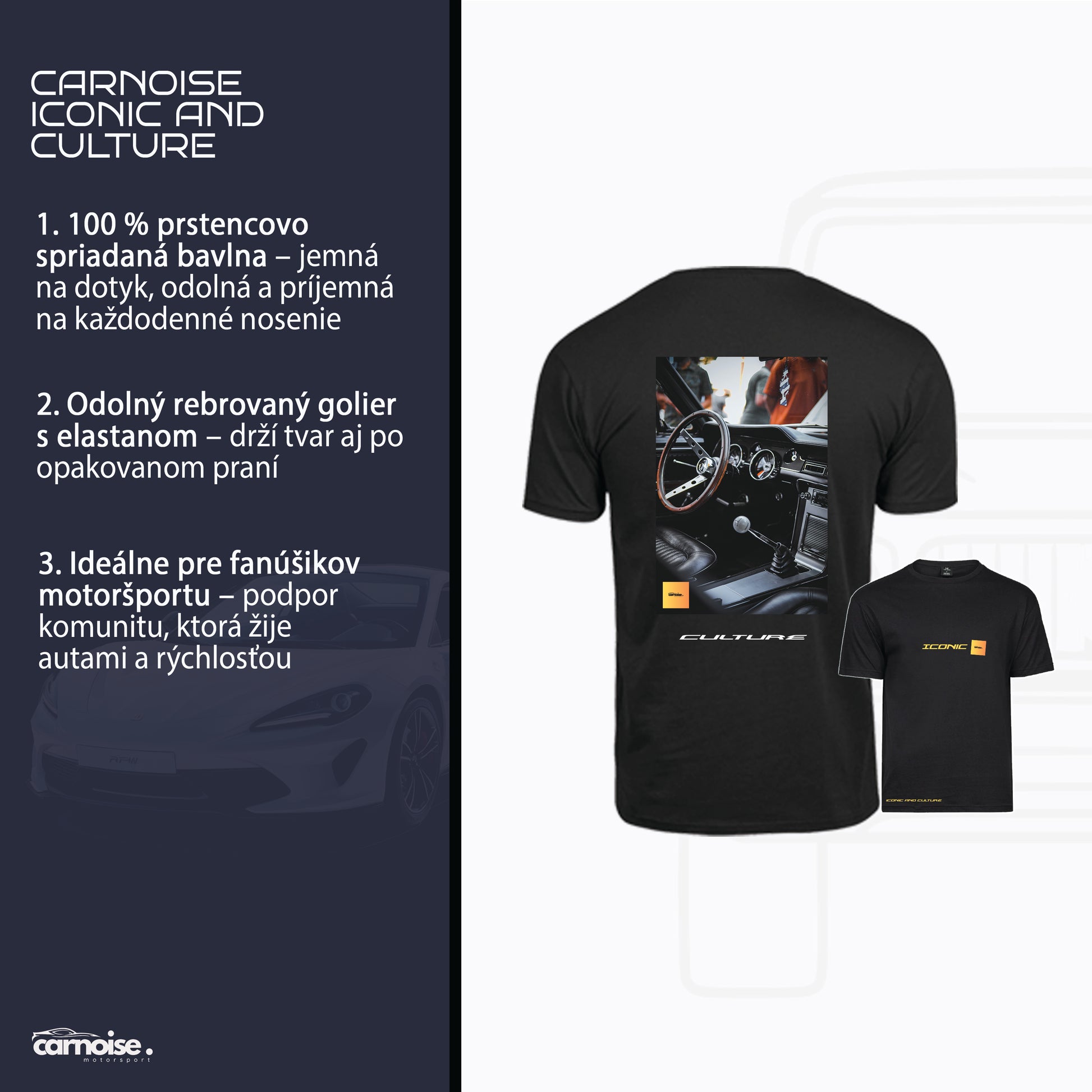 Tento model nesie limitovanú edíciu Iconic & Culture, ktorá symbolizuje vášeň pre autá, lifestyle a komunitu CarNoise. Vďaka klasickému rúrkovému strihu bez bočných švov pôsobí čisto a univerzálne, zatiaľ čo prémiové spracovanie detailov dodáva tričku nádych exkluzivity. Ideálne na voľný čas, eventy, ale aj ako výraz identity pre pravých fanúšikov automobilovej kultúry.